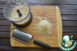 2 зубчика чеснока, луковицу измельчаю в блендере вместе с яйцом. Сыр пармезан натираю на терке.