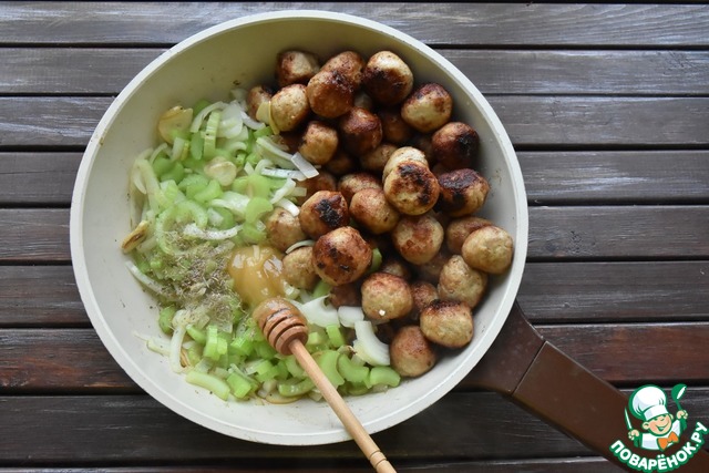 После того как фрикадельки обжарятся, сдвигаю их на один край сковороды и перекладываю нарезанные сельдерей, репчатый лук и чеснок. Когда овощи станут мягкими, а лук прозрачным, добавляю тимьян и мед.