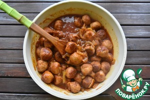 Вливаю томатный соус, накрываю и оставляю фрикадельки томиться в соусе минут 15.