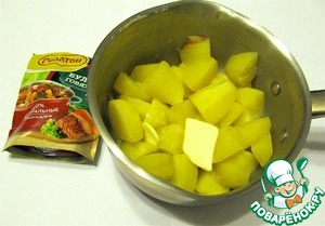 Картофель очистить, нарезать кусочками. В качестве соли и специй использую «Бульон» от ТМ Роллтон говяжий домашний, добавить по вкусу. Состав концентрированного сухого бульона включает ароматные приправы, среди которых сушёные овощи и зелень, а также соль. Залить картофель кипятком, варить до готовности. Картофель лучше использовать рассыпчатых сортов.
