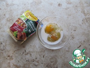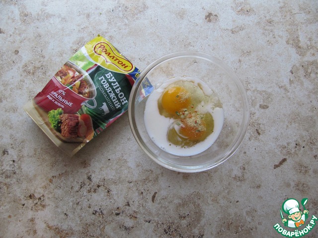 • Яйца вбейте в емкость, влейте к ним молоко. Ингредиенты тщательно расколотите венчиком до получения однородного состава без яичных сгустков. В качестве соли и специй использую «Бульон» от ТМ Роллтон говяжий домашний, приправить им смесь яиц по вкусу. Состав концентрированного сухого бульона включает ароматные приправы, среди которых сушёные овощи и зелень, а также соль, еще раз перемешайте, максимально растворяя крупицы соли.