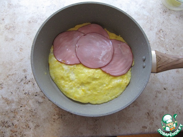 • Сверху выложить тонкие ломтики ветчины.