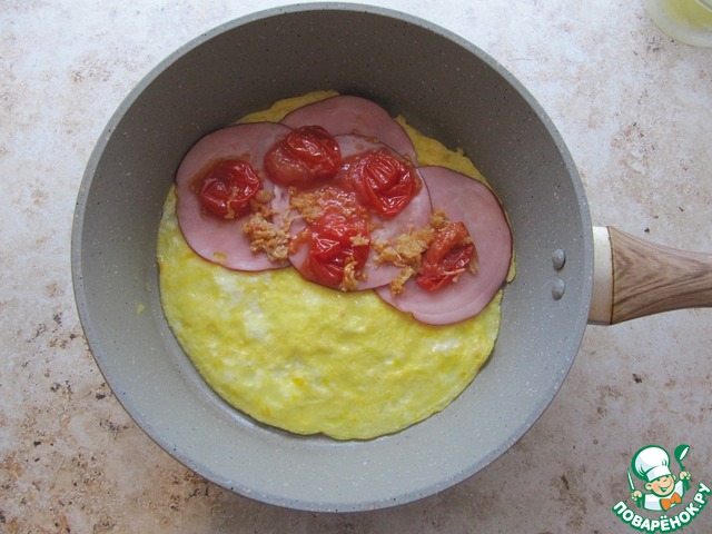 • Затем выложить половинки помидор черри (предварительно прогрела их с чесноком до мягкости на сковородке). Помидоры можно заменить соусом, кетчупом по-своему вкусу.