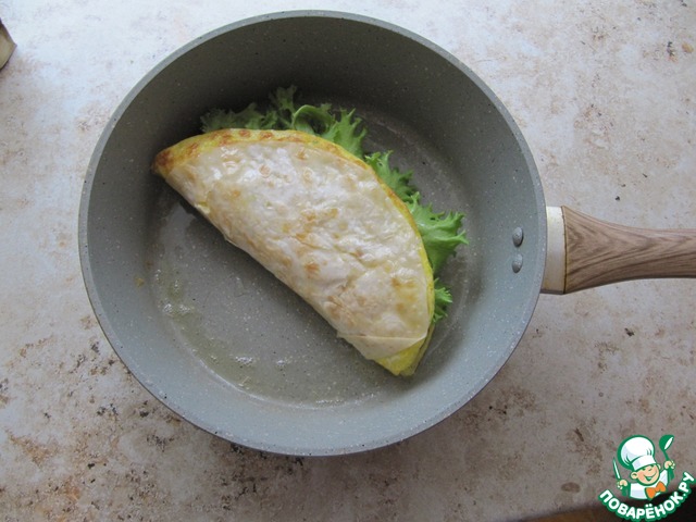 • Быстро обжарить-прогреть омлет с двух сторон. Подавать горячим!