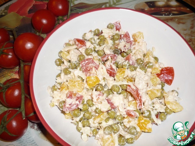 Все смешать, добавить горошек, майонез, соль по вкусу.