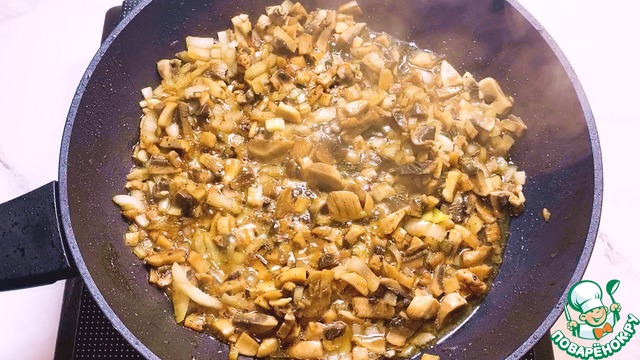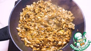 • Затем шампиньоны с луком нарезаем мелким кубиком и обжариваем их.