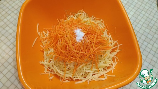 Морковь также натираем на тëрке для корейской моркови. Немного солим, перемешиваем и оставляем на 10 минут. Хорошо отжать картофель с морковкой, слить сок.