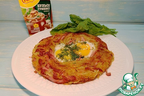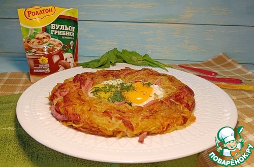 Накрыть тарелкой картофельное кольцо и перевернуть вместе со сковородой. Аккуратно с тарелки перенести кольцо в сковороду. Жарить на медленном огне 5 минут.