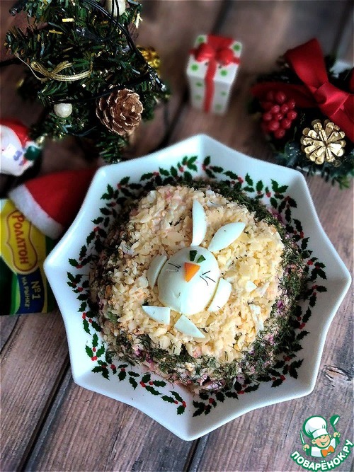 Украшение: фигурка в виде кролика и укропом присыпать немного бока салата. Кролику я сделаю из морковки нос, глаза - из огурца, усы - из тонких веточек укропа. Нос и глаза приклейте капелькой майонеза, усы воткните в белок, рот - крошечная веточка укропа. С ним лучше. Отправить в холодильник, накрыв колпаком, настояться перед подачей на новогодний стол. Салат пропитается. Очень насыщенный вкус, очень сытный, вкусный.