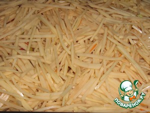 Картошку раньше резала кружочками, но с приобретением терки "Бёрнер" стругаю соломкой, так красивей.