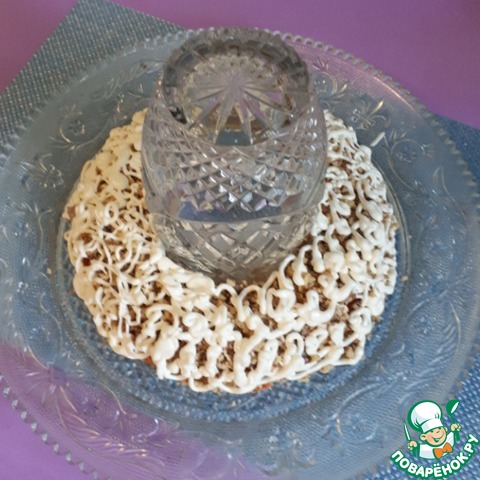 Из кондитерского мешка хаотично поливаем соусом, делая паутинку.