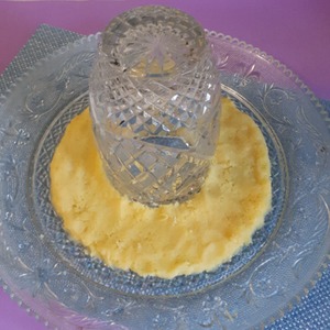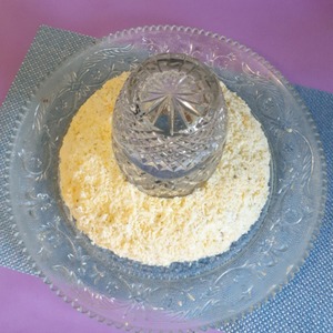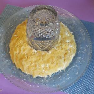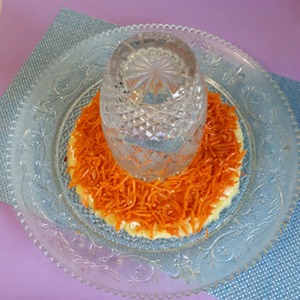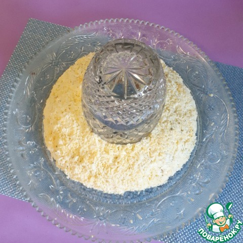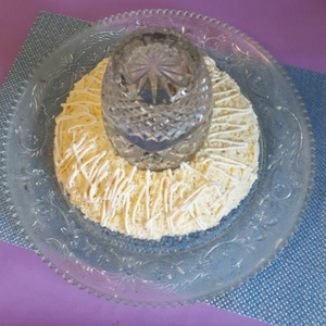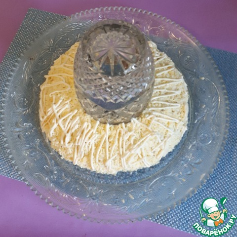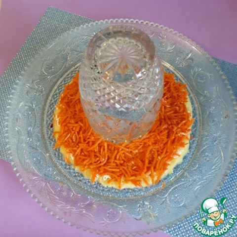 В центр круглого блюда поставить какую-нибудь емкость, у меня вазочка диаметром 10 см. Взять половину натертого картофеля и распределить его по кругу, посолить, поперчить по вкусу.