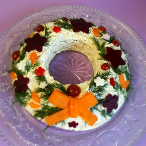 Украшаем венок веточками укропа, из свеклы и моркови вырезаем формочками разные фигурки, помидоры черри разрезаеи пополам и все раскладываем как подскажет фантазия. Получился вот такой нарядный новогодний салат в виде венка.