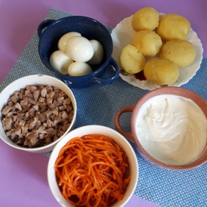 Отварить картофель ( в кожуре) и яйца, очистить их. Мясо индейки нарезать мелко. В рецепте я использую уже готовую морковь по-корейски, ножом или ножницами режу ее. Для соуса смешать сметану, майонез и творожный сыр, все хорошо перемешать.