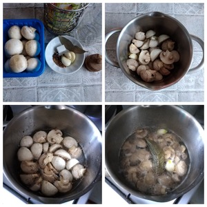 Быстрый рецепт маринования шампиньонов дома - мой любимый, когда такие грибочки очень быстро нужны. Шампиньоны лучше купить маленькие, если они не совсем маленькие, то режим их на 2 части пополам. Их нужно хорошо почистить. Отправляем в кастрюлю. Туда же отправляем все специи, чеснок, соль, сахар и наливаем воду и масло подсолнечное. Ставим на огонь, помешаем, доведём до кипения, накроем крышкой, убавим огонь на минимум и будем варить 5 минут. Далее наливаем уксус, перемешиваем, доводим до кипения и снимаем сразу же с огня. Шампиньоны нужно переложить в банку вместе с жидкостью и дать им остыть. Всё! Их можно использовать для салата или есть просто как закуску, заправив их луком и маслом. Я буду делать с ними салат. Пусть остывают.