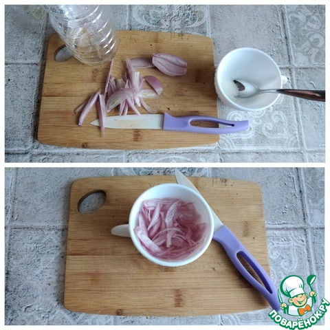 Нам нужно взять салатный лук и замариновать его. Я буду использовать лук шалот. Чистим луковицу и нарезаем её пером. В кружке размешиваем сахар, воду и уксус. Помещаем туда лук. Пусть замаринуется минут 15.