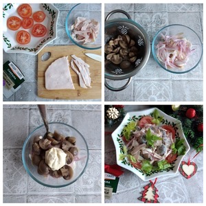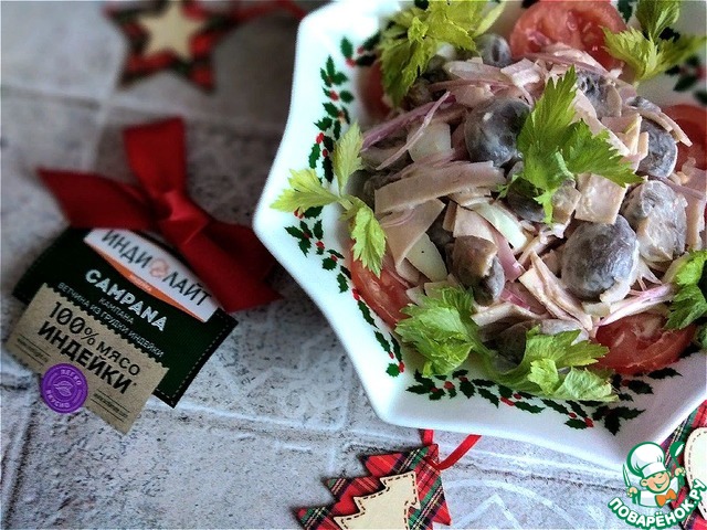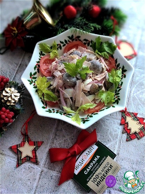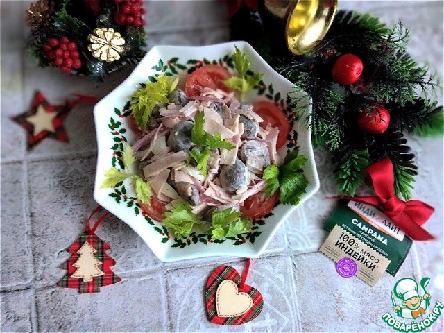 Новогодний или праздничный салат с ветчиной и маринованными шампиньонами. Шампиньоны маринованные в домашних условиях. Ветчина из грудки индейки,... Заходите и познакомьтесь. Этот красивый и вкусный салат украсит и разнообразит ваш праздничный стол..