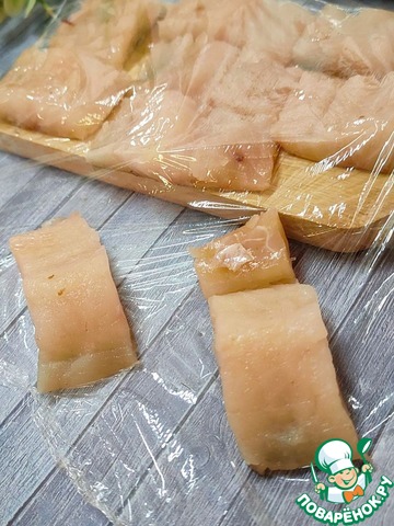 Каждое филе нарежьте ровными кусочками. Положите кожей вниз на разделочную доску. Накройте пищевой плёнкой и отправьте в холодильник.