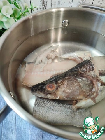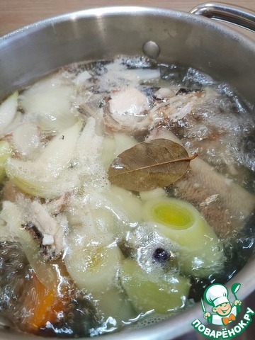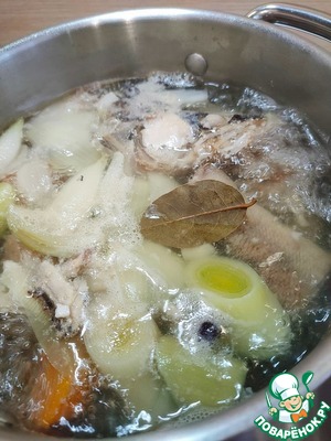 Положите в кастрюлю голову рыбы, хвост, хребет и плавники. Залейте водой и поставьте на огонь. Доведите до кипения. Снимите пену.