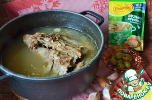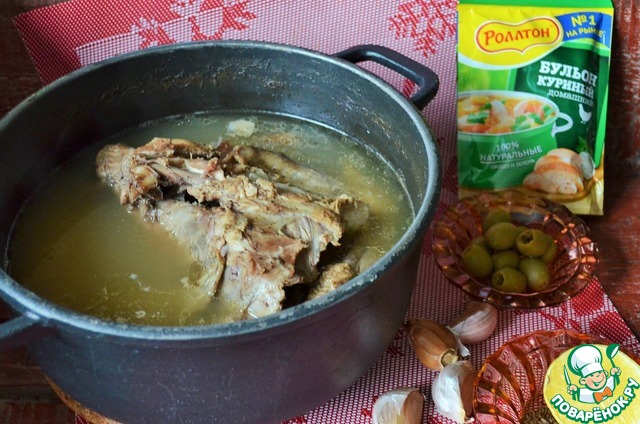 Из остова утиной тушки и крыльев сварить бульон, в 2,5 - ой л. воды, в процессе добавить 1 ч. л. бульона "РОЛТОН" Куриный домашний ". По готовности бульон процедить, мясо выложить на тарелку.