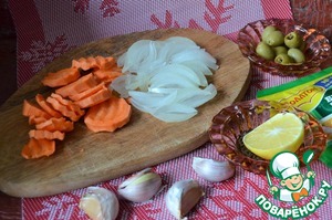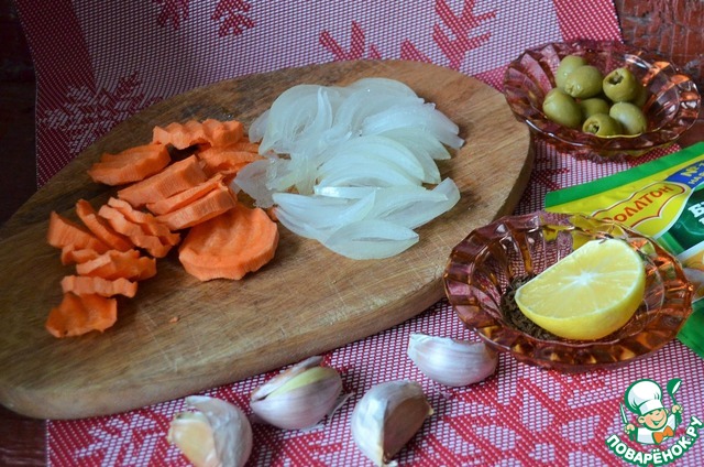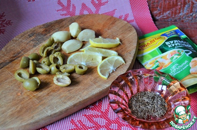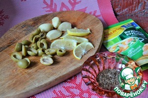 Также нарезать оливки, лимон, чеснок почистить.