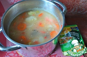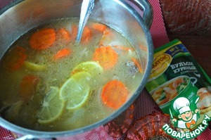 Имбирь ( можно и свежий) нарубить мелко, добавить в суп, довести куриным сухим бульоном по вкусу на соль, дать закипеть и убрать с огня.