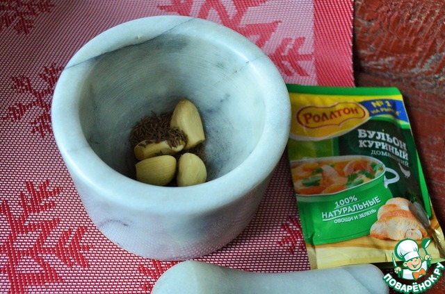 Истолочь чеснок и тмин, добавить в суп.