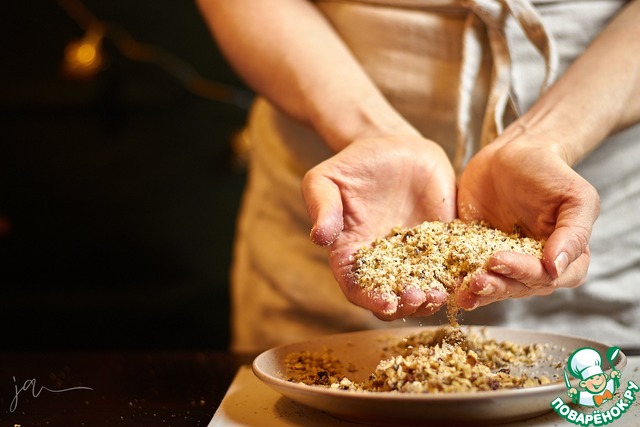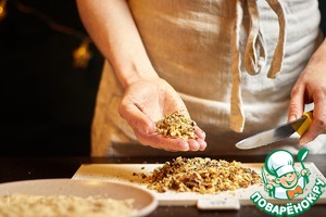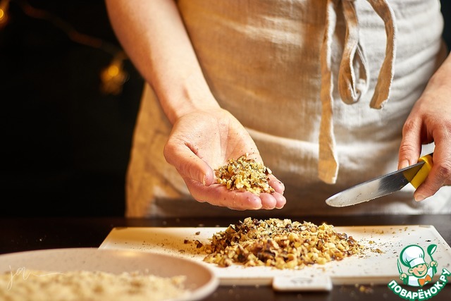 Мелко порубите грецкие орехи. Можно в комбайне, а можно ножом.
