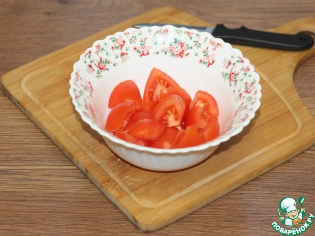 8. Для соуса нарежьте дольками небольшие помидоры.