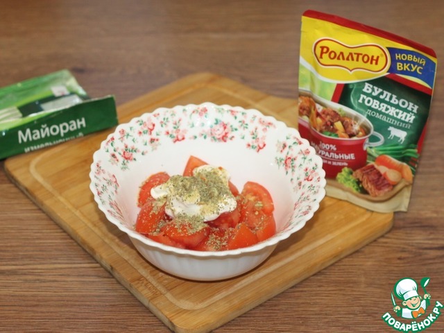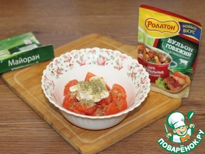 3. Смешайте бульон Роллтон (2 ч. л.) с растительным маслом и щепоткой майорана. В бульоне Роллтон есть соль.
