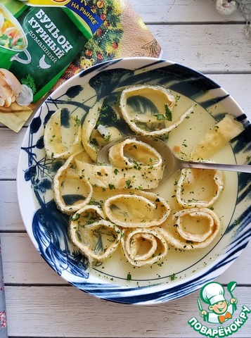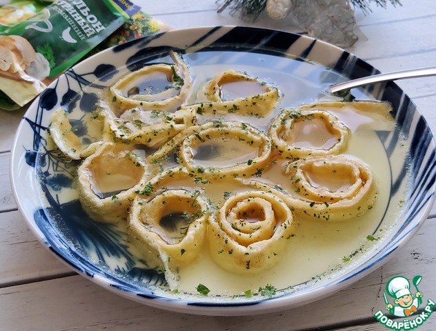 Сворачиваем их роллом и выкладываем в тарелку. Заливаем подготовленным бульоном. На фото порция из одного яйца.