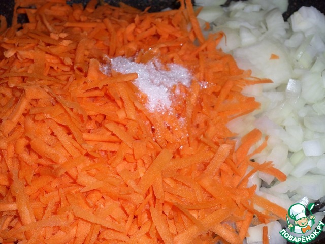 Сковороду ставим на огонь и хорошо разогреваем. Наливаем в нее растительное масло. Выкладываем лук и морковь. Добавляем сахар.