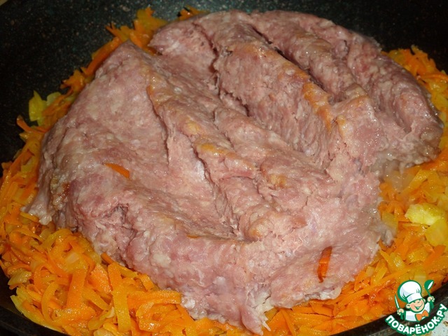 Обжариваем овощи 5-7 минут, помешивая массу. Затем выкладываем в сковороду мясной фарш.