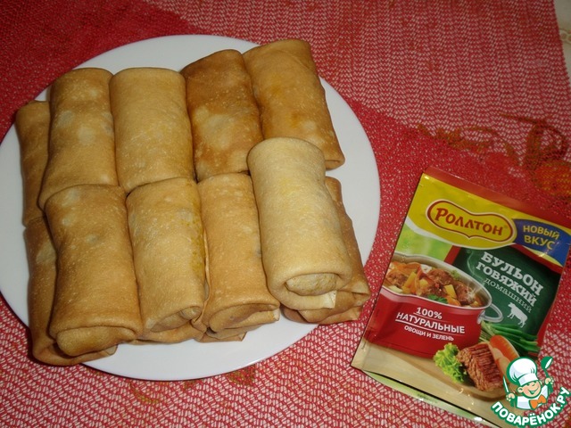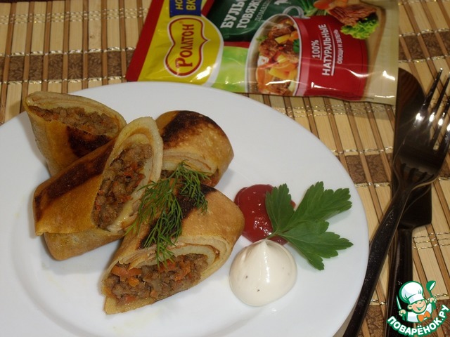 Одно из любимых блюд в нашей семье - это блины с мясом. Сегодня я готовила их, начинив мясным фаршем из утки и кролика с добавлением овощей и бульона ТМ "Роллтон". Попробуйте.)