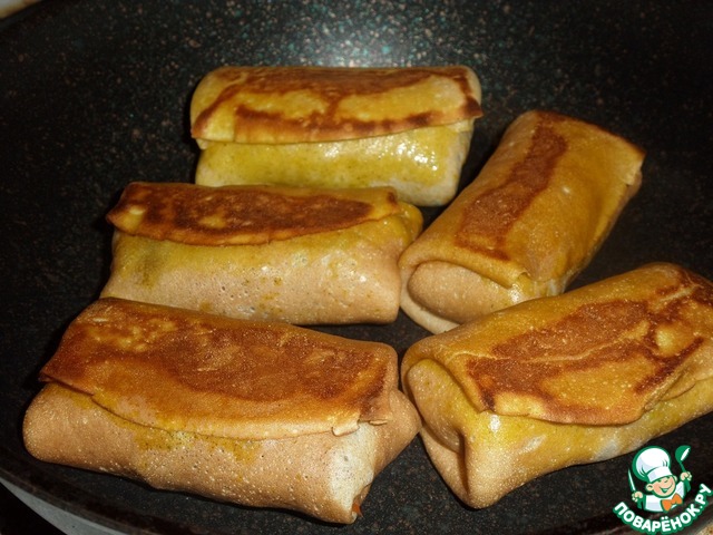 Сковороду разогреваем. Выкладываем на нее фаршированные блины. Обжариваем их по 1-2 минуты с обеих сторон.