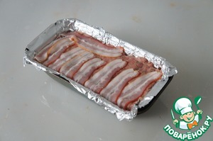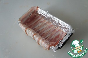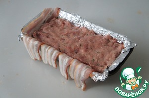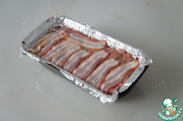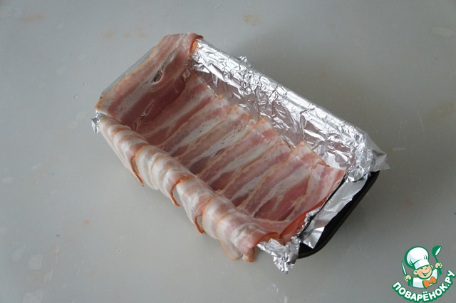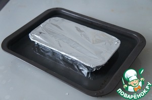 • Обернуть форму с будущим террином фольгой. Поставить в более глубокую форму. Залить горячей водой чуть выше половины.