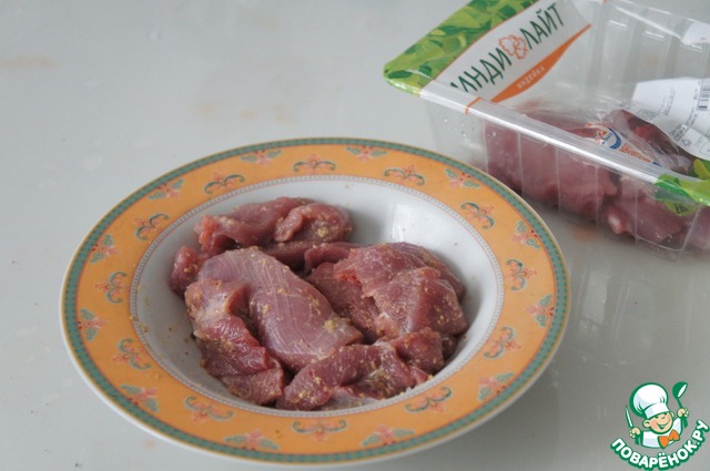 • Филе бедра нарезать крупными полосками поперёк волокон.