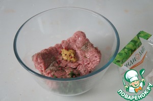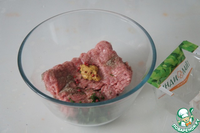 • В фарш добавить остаток горчицы, соль по вкусу, рубленные чеснок и зелень.