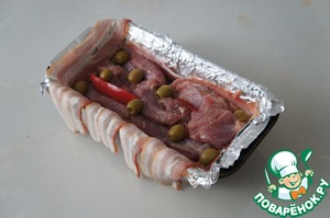 • Положить половину фарша, затем кусочки филе. Прижать рукой. Разложить оливки и полоски болгарского перца.