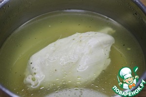 Поставить на огонь, довести до кипения, опустить куриное филе и варить 10 минут.