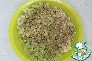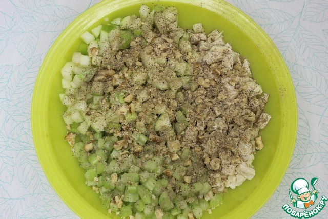 Остывшую курицу, стебель сельдерея и яблоко порезать небольшим кубиком.