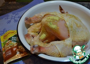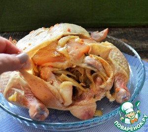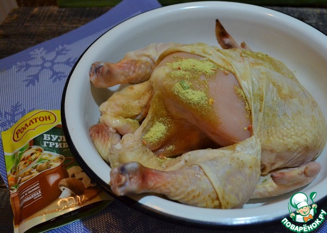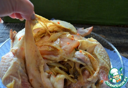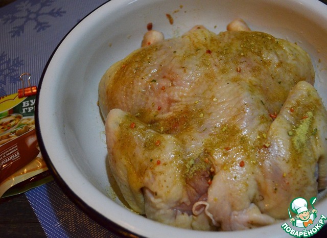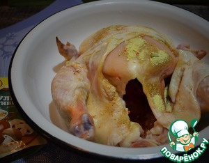 Оставить мариноваться в прохладном месте на 2-24 часа. При этом курицу несколько раз перевернуть и промассировать для лучшего проникновения посолочной смеси.