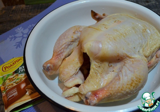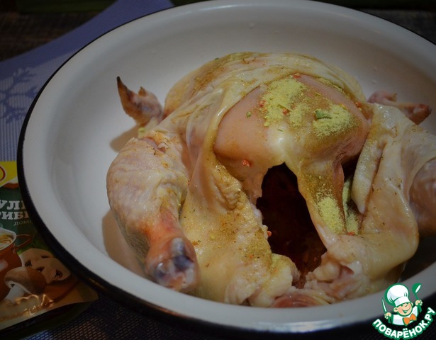 Тщательно натереть курицу грибным сухим бульоном.