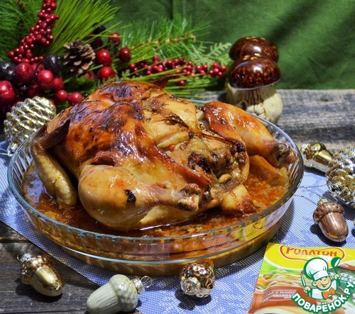 Запекать при 180-200 градусах 1-1,5 часа, до прозрачного сока при прокалывании самой толстой части курицы. Подать горячей.