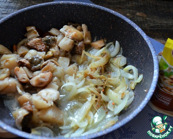 Духовку включить на разогрев. Грибы обжарить с перьями лука на растительном масле, добавив немного сухого грибного бульона.
