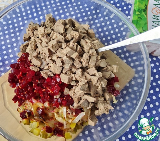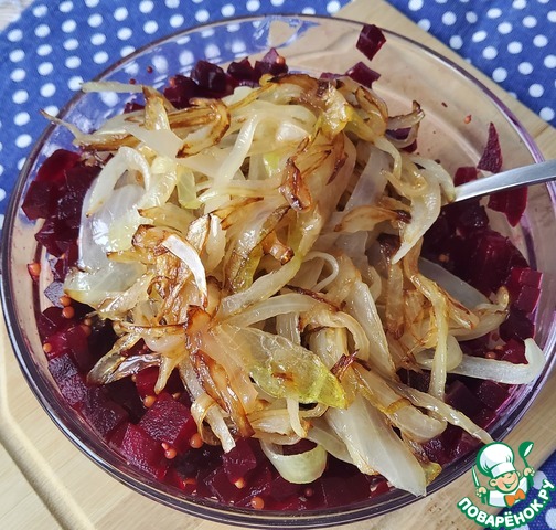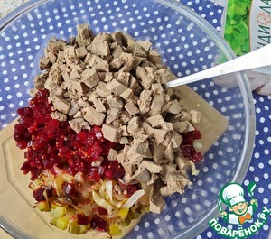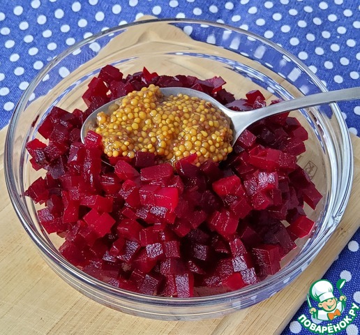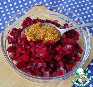 Пока варится индюшачья печень, займёмся остальными ингредиентами. Почистим и порежем свёклу и замаринуем её в горчице (просто добавим горчицу к порезанной свекле и перемешаем).