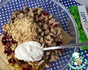 Отварную индюшачью печень порезать по-возможности кубиком. И соединить с остальными ингредиентами салата. Печень можно сварить накануне приготовления салата, оставить в бульоне и потом просто подогреть.