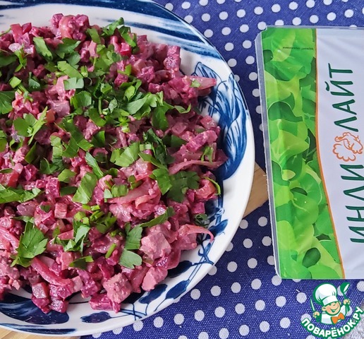 С осторожностью пробовала этот рецепт, так как в салате со свёклой предпочитаю сочетание либо только с овощами, либо с рыбой. Неожиданно вкусным оказалось сочетание с индюшачьей печенью. Салат получился лёгким, сочным и в то же время сытным.