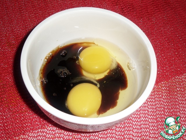 В миску разбиваем 2 куриных яйца. Добавляем соевый соу и растительное масло. -