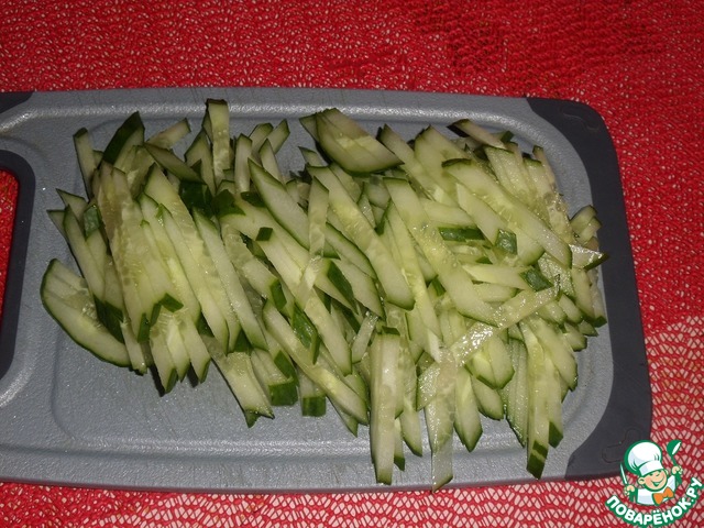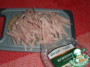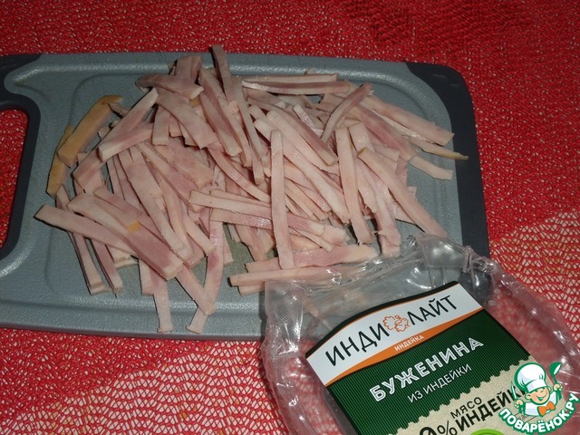 Пока остывают блины, соломкой нарезаем буженину. Я использую буженину из индейки ТМ "Индилайт".
